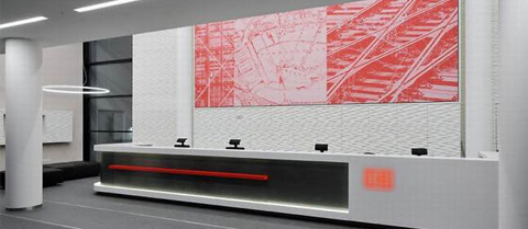 在规划之处,欧林就考虑到品牌文化的重要程度。前台等候区是客户必经和深度诉求之地,在短暂